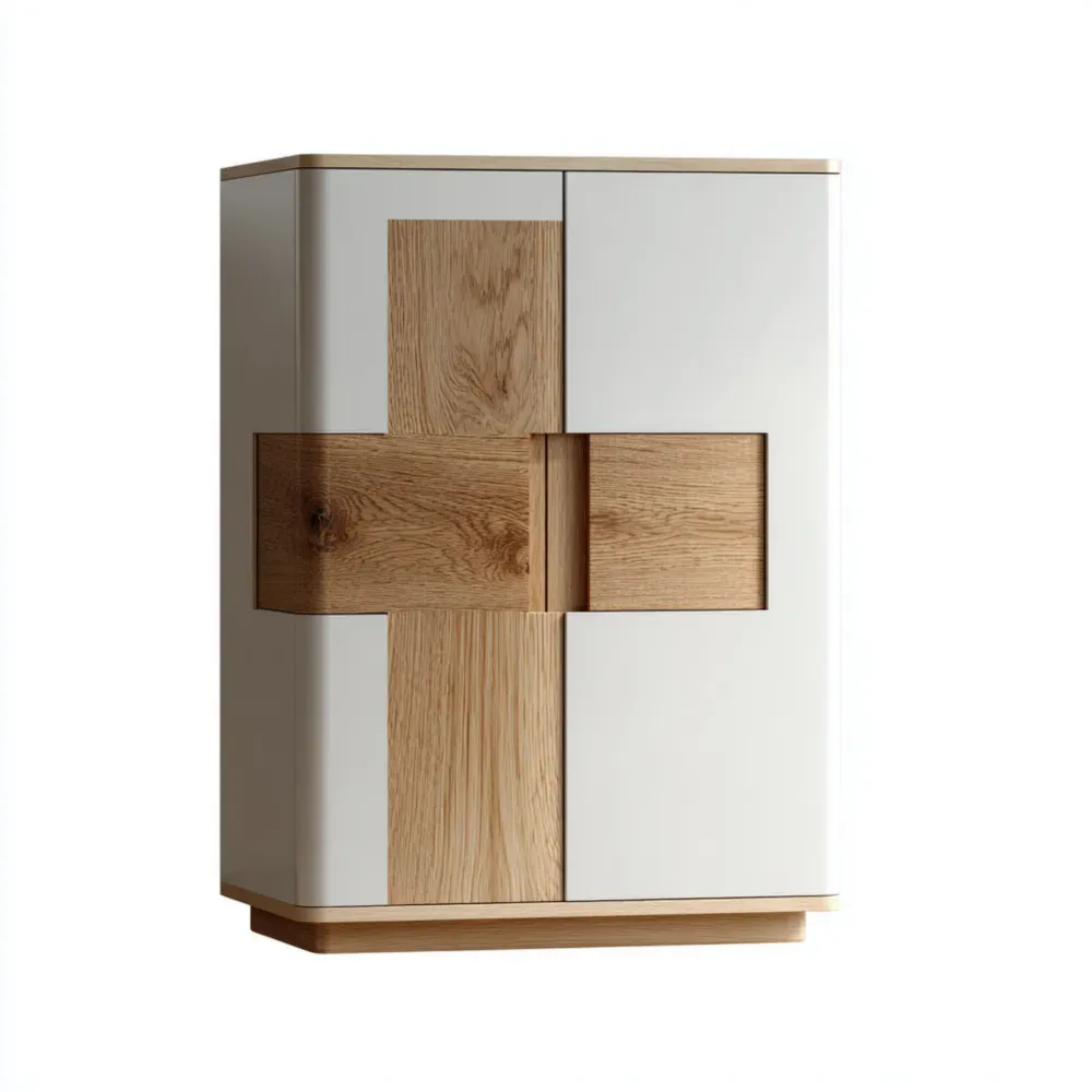 収納キャビネット 木製 90x45x150cm - 自然色とホワイト