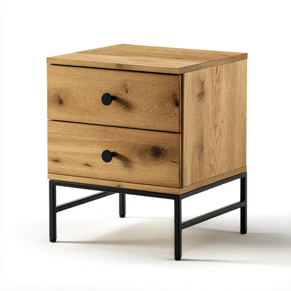 木製ナイトテーブル 2引き出し アイアンフレーム ナチュラル 45x40x55 cm