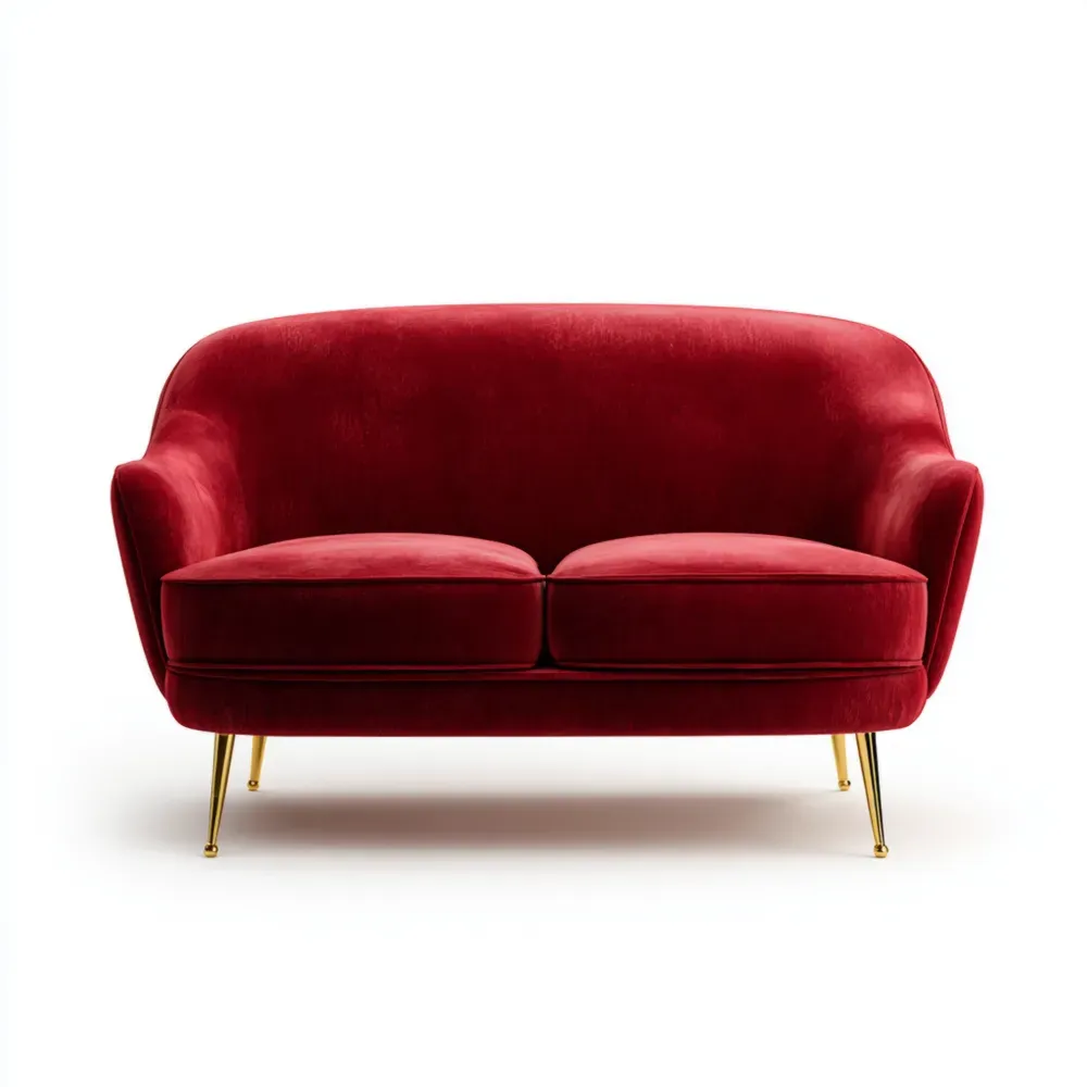 ソファは贅沢なベルベット生地を使用し、深みのあるレッドカラーが特徴です。脚部はゴールド仕上げの金属を使用しています。